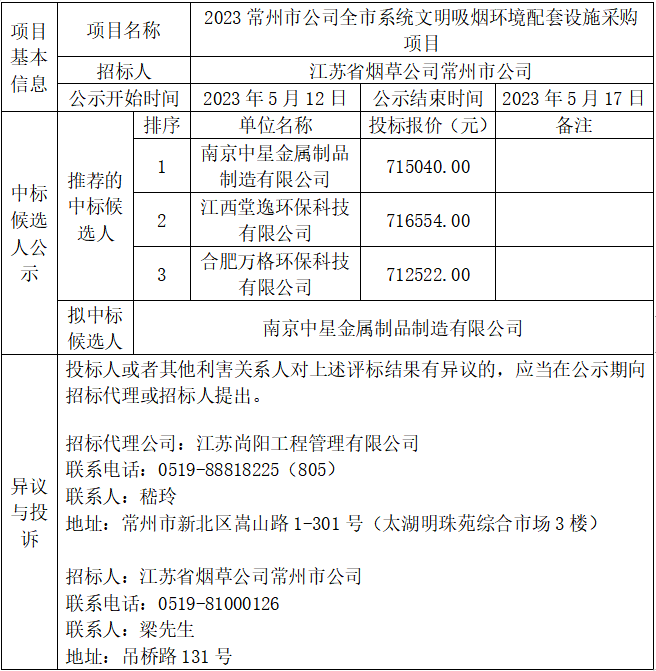 2023常州市公司全市系統(tǒng)文明吸煙環(huán)境配套設(shè)施采購項(xiàng)目中標(biāo)候選人公示