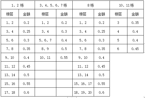 6.小區(qū)自2018年12月1日以來(lái),按照每平方0.4元/月標(biāo)準(zhǔn)對(duì)小區(qū)居民征收電梯運(yùn)行維護(hù)費(fèi)。參考周邊小區(qū)電梯收費(fèi)標(biāo)準(zhǔn),經(jīng)業(yè)委會(huì)討論,自2019年12月起將電梯收費(fèi)標(biāo)準(zhǔn)按照樓層系數(shù)收取,相關(guān)收取標(biāo)準(zhǔn)如下(金額:元/月):