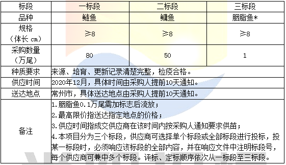 采購需求:本項目是2020下半年長江增殖放流苗種項目,在長江常州段水域開展?jié)O業(yè)資源增殖流放工作,在長江常州段放流體長8cm以上的鰱魚、鳙魚以及胭脂魚魚種,由于采購數(shù)量及苗種品種不同,因此本項目分為三個標段,采購清單如下: