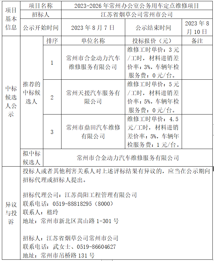 2023-2026年常州辦公室公務(wù)用車定點(diǎn)維修項(xiàng)目中標(biāo)候選人公示