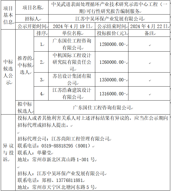 中吳武進表面處理循環(huán)產(chǎn)業(yè)技術(shù)研究示范中心工程(一期)可行性研究報告編制服務(wù)中標候選人公示