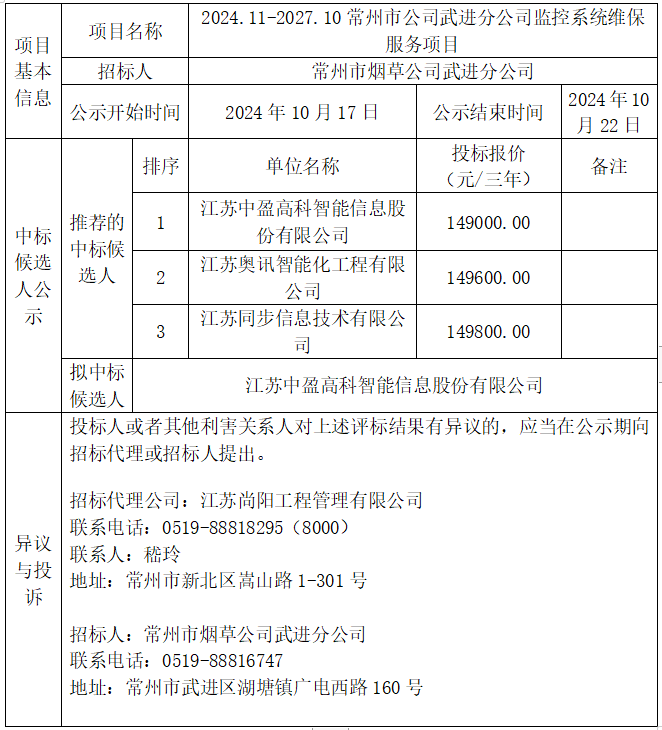 2024.11-2027.10常州市公司武進分公司監(jiān)控系統(tǒng)維保服務(wù)項目中標(biāo)候選人公示