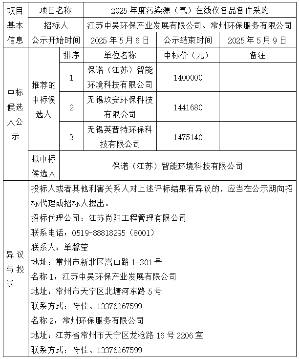 2025年度污染源(氣)在線儀備品備件采購中標(biāo)候選人公示
