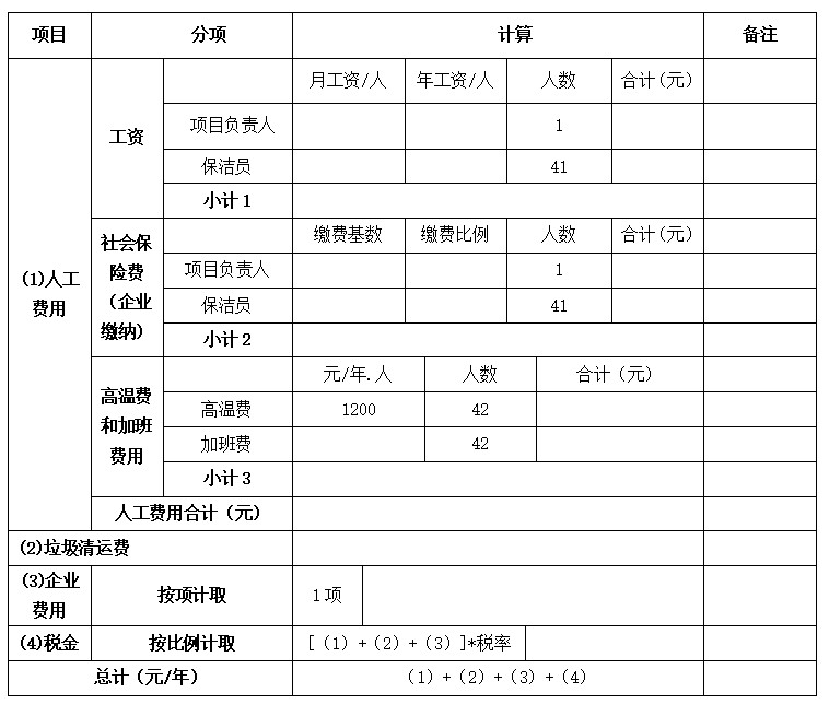 3.分項報價表中各分項年合計、小計、總計計算結(jié)果按照四舍五入法精確到個位(元),其它運算過程均不得取舍;