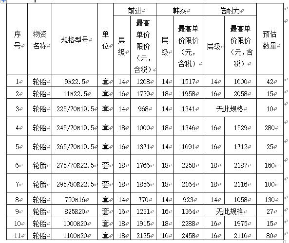 輪胎采購項(xiàng)目更正公告(二)