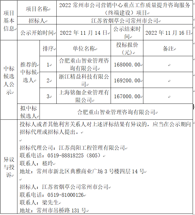 2022常州市公司營銷中心重點(diǎn)工作質(zhì)量提升咨詢服務(wù)(終端建設(shè))項(xiàng)目中標(biāo)候選人公示